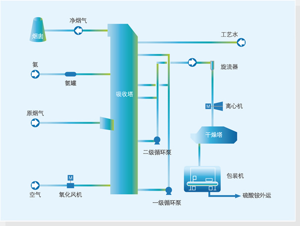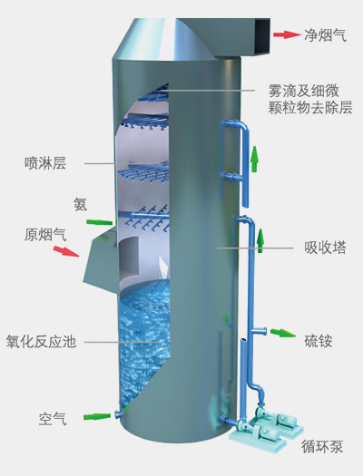 吸(xī)收形成的亞硫酸(氫)銨氧化成硫酸銨,硫酸銨溶液將煙氣溫度降低並蒸發水分,自身(shēn)濃度得到進一(yī)步提高。